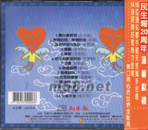 01. 讓心勇敢飛(大合唱) 02. 無情的雨,無情的你(齊秦) 03. 為你我受冷風(fēng)吹(林憶蓮) 04. 沖動(張惠妹) 05. 背叛(張信哲) 06. 明天我要嫁給你(周華健) 07. 沙漏(許茹蕓) 08. 無處躲雨(李玟) 09. 愛情余味(辛?xí)早? 10. 好想談戀愛(范曉萱) 11. 讓自己High(庾澄慶) 12. 有你在身旁(無印良品) 13. 怕你不了解(柯以敏) 14. 火柴天堂(熊天平)