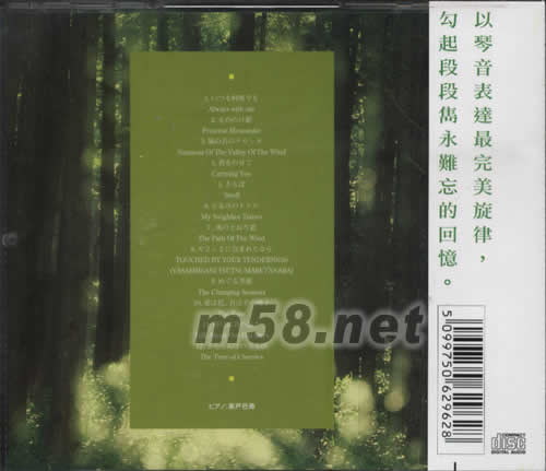 1.千與千尋 ALWAYS WITH ME 2.幽靈公主PRINCESS MONONOKE 3.風之谷NAUSICAA OF THE VALLEY OF THE WIND 4.天空之城CARRYING YOU 5.龍貓STROLL 6.龍貓MY NEIGHBOR TOTORO 7.龍貓THE PATH OF THE WIND 8.魔女宅急便TOUCHED BY YOUR TENDEMESS 9.魔女宅急便THE CHANGING SEASONS 10.歲月的童話THE ROSE 11.飛天紅豬俠TALK ABOUT OUR OLD DAYS 12.飛天紅豬俠THE TIME OF CHERRIES