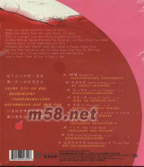 1 蝴蝶 Butterfly 以浪漫的手風(fēng)琴與曼陀鈴樂(lè)音·捕捉愛(ài)情的輕盈與不定 2 甜蜜橙戀 Sweet Orange Love 豎笛\大提琴譜出令人難忘的甜美愛(ài)戀 3 愛(ài)v.s自由 Love v.s Freedom 輕柔的吉他述說(shuō)著這自古難解的愛(ài)情習(xí)題 4 青春之歌 Song of Youth 調(diào)和鋼琴\弦樂(lè),與最青春的情愛(ài)一起唱和 5 相遇 An Encounter 雙簧管與吉他\大提琴安排的是一場(chǎng)最美的邂逅 6 是名…愛(ài) A Rose is a Rose is a Rose 用豎笛與提琴告訴戀人們--愛(ài)情就是愛(ài)情 7 眷戀 Reminiscence 交疊而起的揚(yáng)琴旋律,傾訴著訴著情侶間的戀戀不舍 8 十三月 The 13rd Month 大提琴和琵琶的樂(lè)音,織就出一段深刻的戀情 9 初開(kāi) First Blossoming 鋼琴與弦樂(lè)傾訴著愛(ài)情最初的美麗模樣 10 追憶似水年華 Remembrance of Things Past 雙簧管\提琴以低語(yǔ)輕撫這專屬愛(ài)情的記憶