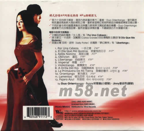 1.POR UNA CABEZA 一步之差 2.EL DIA QUE ME QUIERAS 你愛我的日子 3.ADIOS NONINO 再見父親 4.OBLIVION 遺忘 5.LIBERTANGO 自由探戈 6.IMPERIAL 帝國 7.VIOLENTANGO 激情探戈 8.A ORILLA DEL RIO 母親與姊姊 9.LA PRIMAVERA DE MI TIERRA 故鄉(xiāng)的春天 10.ORIENTANGO 東方探戈 11.LAMENTOS 恨五百年 12.PAJARO AZUL 阿里郎 BY DOU ORIENTANGO --SUNNY 宋敬善(小提琴) JINNY 姜金熙(鋼琴)