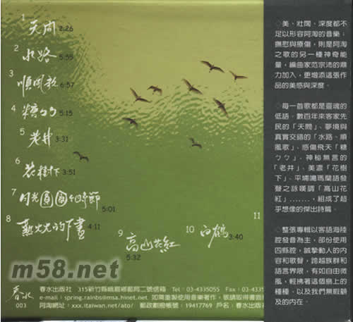 每一首歌都是靈魂的低語,數百年來客家先民的[天問]、夢境與真實交錯的[水路、順風歌、糖]、神秘無言的[老井]、美濃[花樹下]、平鋪噶嗎蘭語發聲之詠嘆調[高山花紅]……,組成了超乎想像的杰出詩篇。