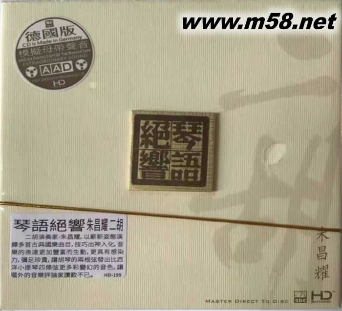 二胡 琴語絕響 模擬母帶聲音 HDCD德版(m58.net) 中國音樂發燒天碟之[二胡傳真/朱昌耀] 日本錄音大師高浪初郎以真空管設備錄制這張發燒天碟,二胡如泣如訴的活生音質、栩栩如生的殘鄉與動態,可說從來沒有如此逼真、美妙的呈現在你耳前過! 朱昌耀為中國一級演奏家,七歲就開始演奏胡琴,技巧當然無話可說。整張專輯以他的二胡技巧展現為主,反革搭配揚琴、古箏、琵琶與蕭等傳統樂器,演奏[空山鳥語]、[二泉映月]等等二胡名曲,收放自如的演奏技巧,表現出來的音樂張力絲毫不讓小提琴專美于前,盡情展現中國傳統音樂之美。日本錄音大師高浪初郎以真空管設備錄制這張發燒天碟,二胡如泣如訴的活生音質、栩栩如生的殘鄉與動態,可說從來沒有如此逼真、美妙的呈現在你耳前過!