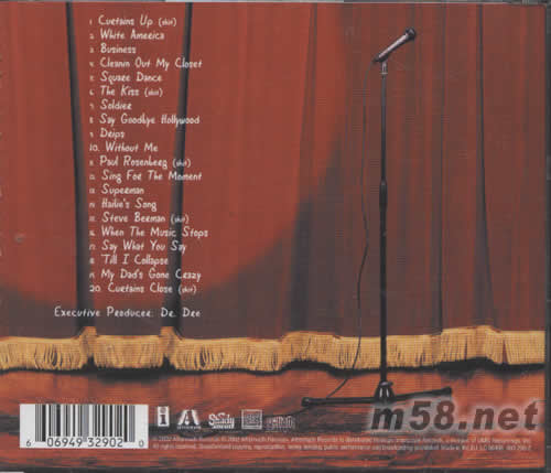 1、CVETAINS UP(SKIT) 2、WHITE AMEEICA 3、BUSINESS 4、CLEANIN OUT MY CLOSET 5、SPUAEE DANCE 6、THE KISS(SKIT) 7、SOLDIEE 8、SAY GOODBYE HOLYWOOD 9、DEIPS 10、WITHOUT ME 11、PAUL ROSENBEEG(AKIT) 12、SING FOE THE MOMENT 13、SUPEEMAN 14、HAILIE‘S SONG 15、STEVE BEEMAN(SKIT) 16、WHEN THE MUSIC STOPS 17、SAY WHAT YOU SAY 18、TILL I COLLAPSE 19、MY DAD’S GONE CEAZY 20、CUETAINS CLOSE(SKIT)