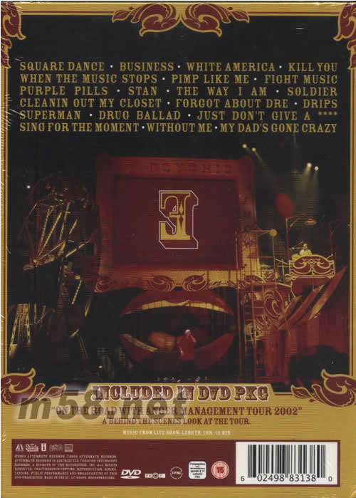 01.Square Dance 02.Business 03.White America 04.Kill You 05.When The Music Stops 06.Pimp Like Me 07.Fight Music 08.Purple Pills 09.Stan 10.The Way I Am 11.Soldier 12.Cleanin' Out My Closet 13.Forgot About Dre 14.Drips 15.Superman 16.Drug Ballad 17.Just Don't Give A [內容被過濾,請注意論壇文明] 18.Sing For The Moment 19.Without Me 20.My Dad's Gone Crazy