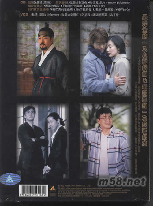 CD 丑聞(1余情 2卸妝) 冬季戀歌(3從開始到現(xiàn)在 4勿忘我 5MY MEMORY 6MOMENT) 情定大飯店(7邂逅的那天 8不能遵守的諾言 9早晨 10為了愛) 我們真的愛過嗎(11我們真的愛過嗎 12為了我的愛 13我的一個痛苦 14破碎的心) VCD 1、余情 2、卸妝 3、MOMENT 4、從開始到現(xiàn)在 5、勿忘我 6、邂逅得那天 7、為了愛