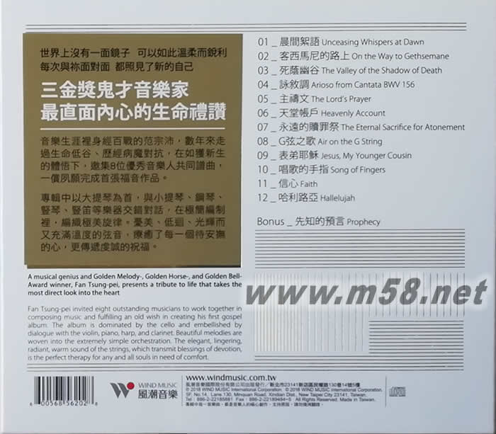 鏡中大提琴(m58.net) 三金獎鬼才音樂家 范宗沛 首張福音作品 最直面內心的生命禮讚 音樂生涯里身經百戰的范宗沛,數年來走過生命低谷、歷經病魔對抗,在如獲新生的體悟下,邀集8位優秀音樂人共同譜曲,一償夙愿完成首張福音作品。 專輯中以大提琴為首,與小提琴、鋼琴、豎琴、豎笛等樂器交錯對話,在極簡編制里,編織極美旋律。憂美、低迴、光輝而又充滿溫度的弦音,療癒了每一個待安撫的心,更傳遞虔誠的祝福。 鏡中的自己 每個人的生命都會因為一件事而改變,改變有大有小、有多有少,有外表也有內在。有人喜歡透過算命,用撲克牌推理,用手指捏一揑,來決定自己的命運。有些人則透過各種管道,去尋找生命中的自我價值和未來。 我很慶幸自己在人生渡過一半時,認識了這位...不知該稱為朋友、導師或心靈伙伴的人物。他是我信仰的依靠,或是,賦予我獨一無二生命的神—耶和華,以及祂的獨生子,我們的救贖者—耶穌! 穌哥在生命的十字路口,導引了我新方向,也帶領著我走出生命的死蔭幽谷。 若你問我怎么認識祂,我會告訴你,祂隨時都在你門口。只要你打開門,請穌哥進來坐、泡杯茶,花點時間認識彼此,敞開心而談;你會發現,祂一直會陪伴在你身邊、在你心里,和你的靈一起成長,一起走過每一個地方。只要你心里呼喊祂的名,衪,就會出現......。 ——范宗沛