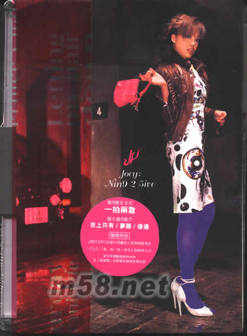 價格為估,以實到貨為準! Nin9 2 5ive(首批限量版)(m58.net) 晚9朝五主打 一拍兩散 朝九晚5推介 世上只有/夢路/借過 隨碟附送 JOEY27英寸X38英寸限量版大型海報換領券 H2OF+[海·妝一色]祖兒化妝速成大法 新世界傳動網(wǎng)星MOBILE及[超值通]流動電話儲值咭現(xiàn)金券 容祖兒繼去年一曲廣告歌「我的驕傲」,成為2003年最受歡迎女歌手。2004年祖兒再接再厲,與原班創(chuàng)作人合作,為食油廣告商唱出全新版本「媽媽好」—主題曲「世上只有」,希望歌頌全世界的母親。此歌曲詞感人,而Joey表示在錄音時更有感懷身世的感覺。 以往祖兒的情歌均以悲情為主,大部分的歌詞都是女方被情人拋棄的;反而新碟中兩首情歌「一拍兩散」和「借過」均是女方主動選擇與他分手,祖兒更在「一拍兩散」中首次唱出女人「一腳踏兩船」的心聲。