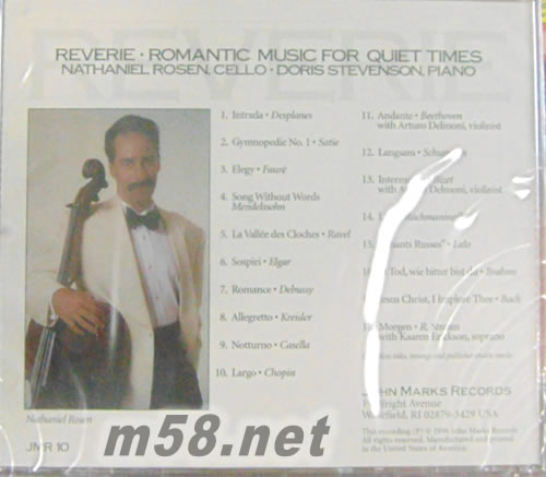 Reverie: Romantic Music for Quiet Times 爸爸教我釣魚(發燒大提琴與鋼琴)(m58.net) 專輯唱片被Stereophile (英文原版美國音響發燒友雜志)評選為:1998年度最佳錄音。 采用四只球形的Schoeps立體聲麥克風錄音,讓您身臨現場的聆聽Rosen明亮又無壓迫感的琴聲。 柴柯夫斯基大賽金牌獎得主羅森Rosen與蒙泰納納Dmenico Montagnana 1738年名琴,一同邀您進入浪漫且寧靜的安可曲。 羅森 Nathaniel Rosen第一位獲獎得的美國大提琴家,引述他的老師Gregor Piatigorsky的話“誓言絕不錄制毫無創意的作品I have made a vow that I will never play one uninspired note in a recording studio ”,來為自己的作品立下最好的說明。 《羅森大提琴幻想曲 Nathaniel Rosen Reverie》中收錄了18首小品。包括:孟德爾頌、德布西、克萊斯勒、蕭邦、巴哈、史特勞斯、比才…等作曲家知名作品。鋼琴家Doris Stevenson貫穿全場,將大提琴的音色襯托的更滑潤甜美。片中John Marks公司除了邀請了Arturo Delmoni與Rosen合奏了貝多芬及比才的作品外,更壓軸安排了世界知名的紐約首席女高 Kaaren Erickson演唱史特勞斯的作品:早晨Morgen 。