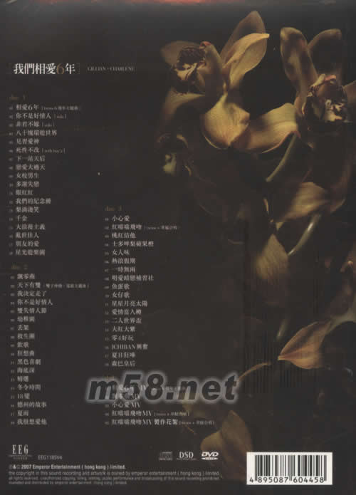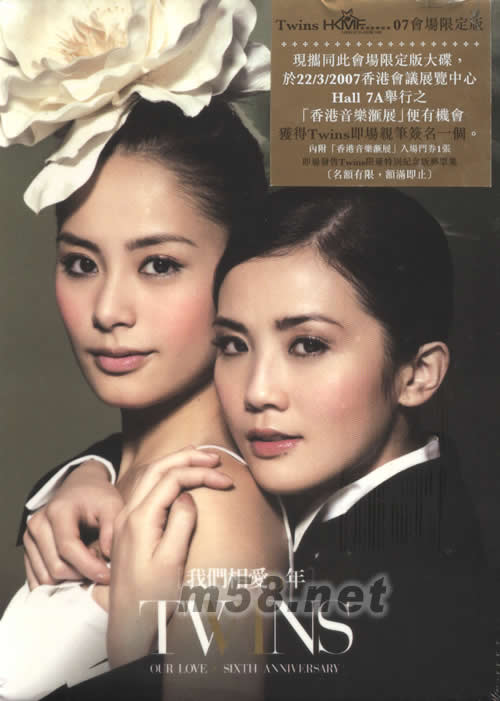 我們相愛6年(新曲+精選)(會場限定版)(m58.net) 尺寸:19*14*2.8CM 現協同會場限定版大碟,于22/3/2007香港會義展覽中心 HALL 7A舉行之[香港音樂匯展]便有機會獲得TWINS即場親筆簽名一個. 內附[香港音樂匯展]入場門券1張 即場發售TWINS限量特別紀念版郵票集 [名額有限,額滿即止] 3CD+1DVD 2首全新 MV [相愛6年MV][飄零燕MV]