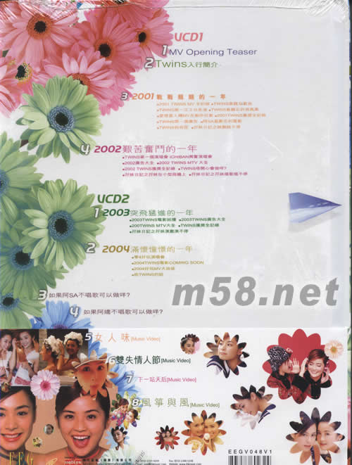 VCD 1 1、MV Opening Teaser 2、Twins入行簡介 3、2001戰(zhàn)戰(zhàn)兢兢的一看 2001TWINS MV全記錄 TWINS最難忘歌曲 TWINS第一次上臺表演 TWINS最難忘寫真集 愛情當(dāng)入樽MV及制作花絮 2001TWINS獲獎全記錄 TWINS每一個廣告 阿AS最難忘的電影 TWINS奇技 仔妹日記之跳舞跳不停 4、2002艱苦奮斗的一年 TWINS第一個演唱會 ICHIBAN興奮演唱會 2002廣告大全 2002TWINS MTV大全 2002TWINS獲獎全記錄 TWINS唔開心會做咩? 仔妹日記之仔妹在小型飛機(jī)上 仔妹日記之仔妹唱歌唱不停 VCD 2 1、2003突飛猛進(jìn)的一年 2003TWINS電影巡禮節(jié) 2003TWINS廣告大全 200TWINS MTV大全 TWINS獲獎全記錄 仔妹日記之仔妹演戲演不停 2、2004滿懷憧憬的一年 零四好玩演唱會 2004TWINS電影COMING SOON 2004好玩MV大放送 給TWINS的話 3、如果阿SA不唱歌可以做咩? 4、如果阿嬌不唱歌可以做咩? 5、女人味9Music Video] 6、雙失情人節(jié)[Music Video] 8、風(fēng)箏與風(fēng)[Music Video]