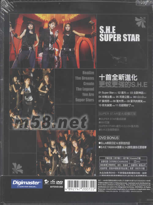 SUPER STAR KARAOKE DVD(m58.net) 隨DVD加送「SUPER STAR 星光燦爛花絮」,內(nèi)有不少她們最新的訓(xùn)練及MV制作花絮,更有她們金曲獎(jiǎng)感言!此DVD更特別加輯ELLA病房日記及給歌迷的話,還有S.H.E最新CM廣告花絮精華!