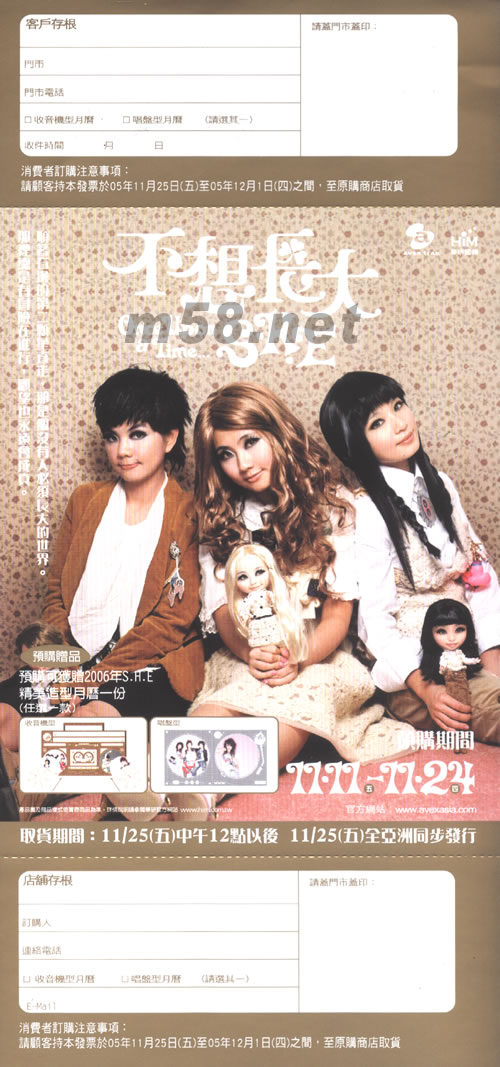 預(yù)購(gòu)就有機(jī)會(huì)!獲得幸運(yùn)大禮! 以下四位顧客獲得SHE《時(shí)光日記薄》各一本(隨碟寄) 51122011 51110041 51110047 51114039 以下四位顧客獲得《不想長(zhǎng)大預(yù)購(gòu)原版海報(bào)》各一張(海報(bào)筒單寄,普通包裹) http://m.m1ntcellars.com/ProductDetail.asp?Product_Id=630499320 51121001 51114023 51112021 51111049