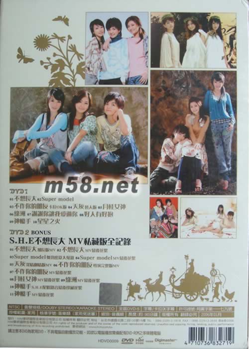 不想長大 原聲原影 Karaoke 影音館 DVD(臺灣版)(m58.net) 不只給你好聽還要給你更好看 S.H.E不想長大影音館雙效特大包 新年大回饋十首精彩MV完整伴唱全壘打 特別收錄[S.H.E不想長大 MV 私藏版全紀錄]完整MV+超爆笑幕后花絮大公開保證驚呼不斷?。IGH翻全場?。?br>