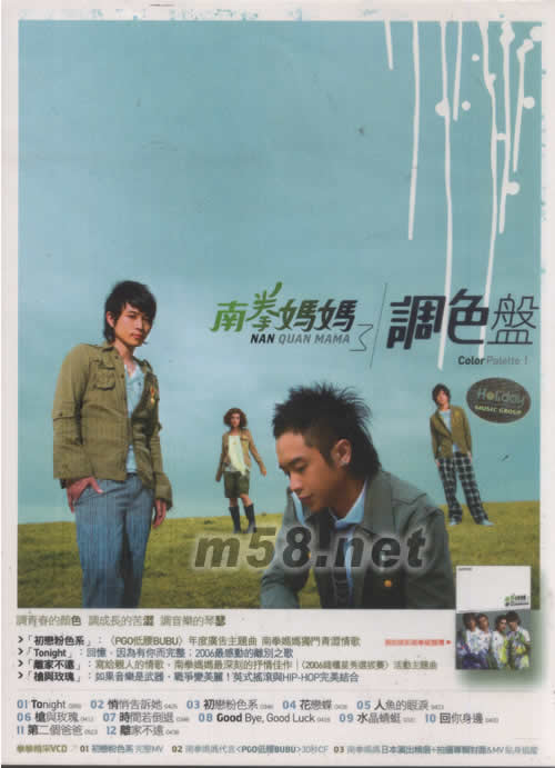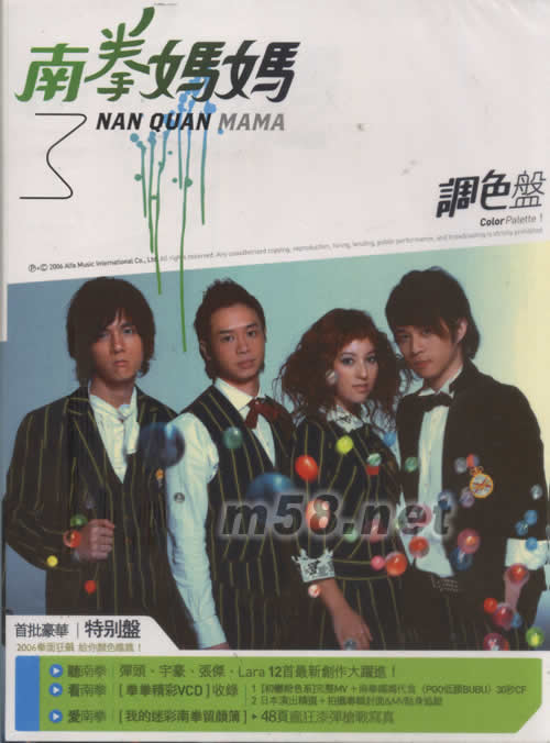 價格為估,以實到貨為準! 調色盤(臺灣首批豪華 特別盤)(m58.net) 聽南拳[彈頭、宇豪、張杰、LARA12首最新創作大躍進!] 看南拳[拳拳精彩VCD]收錄: 1、[初戀粉色系]完整MV+南拳媽媽代信(PGO低腰BUBU)30秒CF 2、日本演出精選+折攝專輯封面 MV貼身追蹤 愛南拳[我的迷彩南拳留顏簿]48頁瘋狂漆彈槍戰寫真 調青春的顏色 調成長的苦澀 調音樂的琴瑟 [初戀粉色系]:(PGO低腰BUBU)年度廣告主題曲南拳媽媽獨門青澀情歌 [TONIGHT]:回憶,因為有你而完整;2006最感動的離別之歌 [離家不遠]:寫給親人的情歌,南拳媽媽最深刻的抒情佳作(2006錢柜星秀選拔賽)活動主題曲 [槍與玫瑰]:如果音樂是武器,戰爭變美麗!英式搖滾與HIP-HOP完美結合