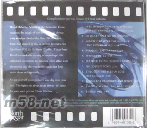 漫游影畫院(m58.net) 漫游影畫院 大衛這張專輯利用電影作為主題,輯錄他最愛的《綠野仙蹤》《鐵達尼號》《羅密歐與茱麗葉》等的主題曲,聽后立刻幻想許多電影片段和回憶,感覺煥然一新。