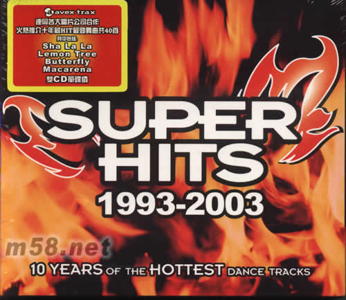 價格為估,以實到貨為準! SUPER HITS 1993-2003(m58.net) AVES TRAX 連同各大唱片分司合作 火熱推介十年最HIT最勁舞曲共40首 其包括: SHA LA LA LEMON TREE BUTTERFLY MACARENA 雙CD單碟價