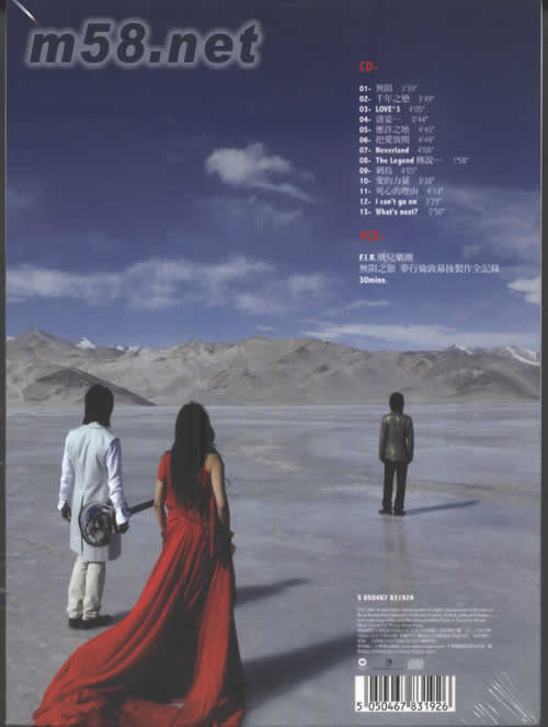 CD 1、無限 2、千年之戀 3、LOVE 3 4、盛宴 5、應許之地 6、把愛放開 7、NEVERLAND 8、THE LEGEND 9、刺鳥 10、愛的力量 11、死心的理由 12、E CAN’T GO ON 13、WHAT‘S NEXT VCD F.I.R飛兒樂團 無限之旅夢行倫敦幕后制作全記錄 30分鐘
