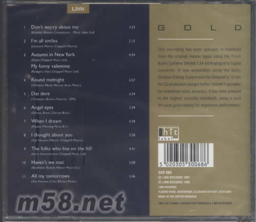 價(jià)格為估,以實(shí)到貨為準(zhǔn)! ALL MY TOMORROWS 24KT GOLD(m58.net) Carol Kidd卡羅爾姐姐被譽(yù)為英國(guó)最佳女歌手,她有著豐富的演唱經(jīng)驗(yàn)和成熟的智慧,對(duì)于歌曲的駕馭度相當(dāng)高,她在著名的音響名牌LINN旗下灌錄的幾張專輯深受發(fā)燒友的推崇。 卡羅爾的音樂(lè)風(fēng)格呈多樣化,爵士、流行、民謠均有涉足,LINN從她以往的專輯中挑選出精彩的曲目,推出了這張黃金CD精選輯。她的唱腔輕柔美妙,無(wú)論唱哪種類型的歌曲,都能輕易俘獲聽(tīng)眾的心靈,親和力極強(qiáng)。