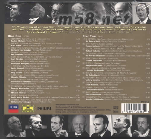 價格為估,以實到貨為準! MASTER OF CONDUCTING(m58.net) 請點看產品正、背面大圖 大師級HIFI示范 指揮界27位殿堂級人馬 靚聲推介 CD1 1 貝多芬第5交響曲 2布拉姆斯[匈牙利舞曲] 7 史特勞斯[藍色多瑙河] CD2 5 比才[卡門]間奏曲 7巴赫D小調角技曲