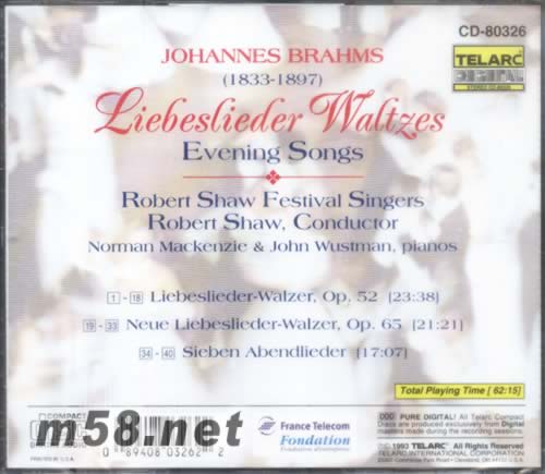 布拉姆斯-華爾茲 Liebeslieder-walzer(m58.net) 這張專輯是由Robert Shaw Festival Singers所演出的,這個團體是由美國合唱音樂之父Robert Shaw在1988年所成立。Robert Shaw一生獻身於合唱工作,研究了各種教學方法,舉辦過無數場的研習課程,提供合唱指揮完善的學習空間,而他對音樂的要求更是嚴格,其中的節奏及拍子必須精確的演奏出,音準那就更不在話下。由其領導的合唱團,聲部互融不突兀,層次分明,因此在聆聽時可以充分地享受其準確性的完美表現。 這張專輯收集了布拉姆斯的作品情歌圓舞曲Liebeslieder-walzer及Nene Liebeslieder-walzer,再加上夜晚之歌兩首Sieben Abendlieder (Seven Evening Songs )。布拉姆斯Johannes Brahms (5/7/1833-4/3/1897),乃承襲了貝多芬以來古典樂派的形態,再以浪漫主義的手法,創造出和聲深厚、管弦樂富麗、結構嚴謹的音樂,具有駕馭人聲融入旋律的歌曲創作能力。他的音樂織度常是豐潤溫暖的,有時甚至具有催眠力,游走於恬美的憂鬱與貝多芬式的自我防御之間。寫給混聲合唱和鋼琴四首聯彈的《情歌圓舞曲》 ( Liebeslieder Waltzes ),他運用當時社會所喜愛的圓舞曲節奏及音樂,選擇歌德(第二組)的情詩,譜成混聲四部(加上獨唱者)的合唱曲,特別的是,以四手聯彈鋼琴伴奏;本曲旋律情感豐富但內歛,流瀉著布拉姆斯特有的抒情性,并且蘊藏著熾烈的感情。 在這張專輯中我覺得Robert Shaw Festival Singers表現十分令人讚賞,混聲四部音色整齊融合,聲音乾凈讓人感覺舒服,各聲部間平衡得恰到好處,高音的表現更是令我欽佩!圓潤不尖銳又十分地乾凈清楚,而低音寬廣,大小聲的變化對比強烈,音樂性的表現更是深深的吸引著我,細膩的表現出感情變化,使人情不自禁得細細聆聽。但美中不足的是鋼琴的配樂太過於大聲,有時甚至會遜L主旋律及合唱團。而其中的獨唱,聲音表現十分完美,但情感的表達似乎略顯不足......。但大體來說這張專輯我十分地喜愛,在聆聽它時使我人心情放鬆愉悅,忘卻煩惱,不時的會想舞動身體,與音樂一同搖癒C而在欣賞這張專輯時必須用心去體會,便可以感受到之中的每一個音符都充滿著情感,也充滿著生命的感動啊!因此這張專輯更是會令人越聽越愛,愛不釋手,而也就越來越能體會其中音樂的語法、感情的累積,是愛樂者不容錯過的!