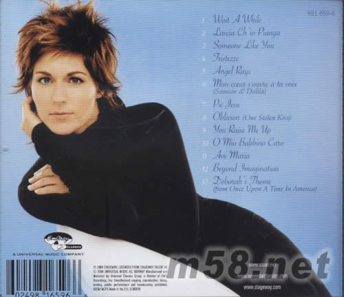 1、WAIT A WHILE 2、LASCIA CHIO PIANGA 3、SOMEONE LIKE YOU 4、JRISTEZZE 5、ANGEL RAYS 6、MON COEUR S‘OUV‘RE A TA VOIX(SAMSON&DALILA) 7\PIE JESU 8\OBLIVION(ONE STOLEN KISS) 9\YOU RAISE ME UP 10\O MIO BABBINO CARO 11\AVE MARIA 12\BEYOND JMAGINATION 13\DEBORAH'S JHEME (FROM ONCE UPON A TIME IN AMERICA)