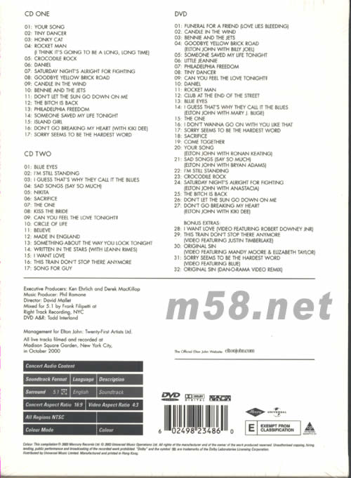 CD ONE 01: : YOUR SONG 02: : TINY DANCER 03: : HONKY CAT 04: : ROCKET MAN (I THINK IT’S GOING TO BE A LONG, LONG TIME) 05: : CROCODILE ROCK 06: : DANIEL 07: : SATURDAY NIGHT’S ALRIGHT FOR FIGHTING 08: : GOODBYE YELLOW BRICK ROAD 09: : CANDLE IN THE WIND 10: : BENNIE AND THE JETS 11: : DON’T LET THE SUN GO DOWN ON ME 12: : THE BITCH IS BACK 13: : PHILADELPHA FREEDOM 14: : SOMEONE SAVED MY LIFE TONIGHT 15: : ISLAND GIRL 16: : DON’T GO BREAKING MY HEART (WITH KIKI DEE) 17: : SORRY SEEMS TO BE THE HARDEST WORD CD TWO 01: : BLUE EYES 02: : I’M STILL STANDING 03: : I GUESS THAT’S WHY THEY CALL IT THE BLUES 04: : SAD SONGS (SAY SO MUCH) 05: : NIKITA 06: : SACRIFICE 07: : THE ONE 08: : KISS THE BRIDE 09: : CAN YOU FEEL THE LVOE TONIGHT? 10: : CIRCLE OF LIFE 11: : BELIEVE 12: : MADE IN ENGLAND 13: : SOMETHING ABOUT THE WAY YOU LOOK TONIGHT 14: : WRITTEN IN THE STARS (WITH LEANN RIMES) 15: : I WANT LOVE 16: : THIS TRAIN DON’T STOP THERE ANYMORE 17: : SONG FOR GUY DVD 01: : FUNERAL FOR A FRIEND (LOVE LIES BLEEDING) 02: : CANDLE IN THE WIND 03: : BENNIE AND THE JETS 04: : GOODBYE YELLOW BRICK ROAD(ELTON JOHN WITH BILLY JOEL) 05: : SOMEONE SAVED MY LIFE TONIGHT 06: : LITTLE JEANNIE 07: : PHILADELPHIA FREEDOM 08: : TINY DANCER 09: : CAN YOU FELL THE LOVE TONIGHT? 10: : DANIEL 11: : ROCKET MAN 12: : CLUB AT THE END OF THE STREET 13: : BLUE EYES 14: : I GUESS THAT’S WHY THEY CALL IT THE BLUES (ELTON JOHN WITH MARY J. BLIGE) 15: : THE ONE 16: : I DON’T WANNA GO ON WITH YOU LIKE THAT 17: : SORRY SEEMS TO BE THE HARDEST WORD 18: : SACRIFICE 19: : COME TOGETHER 20: : YOUR SONG (ELTON JOHN WTH RONAN KEATING) 21: : SAD SONGS (SAY SO MUCH) (ELTON JOHN WITH BRYAN ADAMS) 22: : I’M STILL STANDING 23: : CROCODILE ROCK 24: : SATURDAY NIGHT’S ALRIGHT FOR FIGHTING (ELTON JOHN WITH ANASTACIA) 25: : THE BITCH IS BACK 26: : DON’T LET THE SUN GO DOWN ON ME 27: : DON’T GO BREAKING MY HEART (ELTON JOHN WITH KIKI DEE) DVD BONUS EXTRAS 28: : I WANT LOVE (VIDEO FEATURING ROBERT DOWNEY JNR) 29: : THIS TRAIN DON’T STOP THERE ANYMORE (VIDEO FEATURING JUSTIN TMBERLAKE) 30: : ORIGNAL SIN (VIDEO FEATURING MANDY MOORE & ELLZABETH TAYLOR) 31: : SORRY SEEMS TO BE THE HARDEST WORD (VIDEO FEATURING BLUE) 32: : ORIGINAL SIN (DAN-O-RAMA VIDEO REMIX)