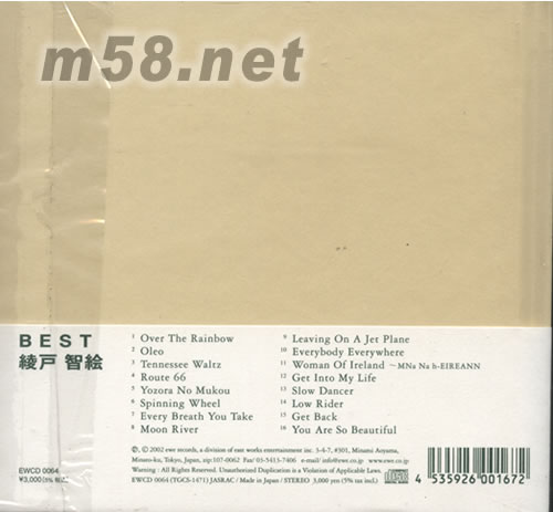 BEST綾戶智繪精選(m58.net) 請點看專輯正、背面大圖 國際級超人氣爵士、R&B日籍女歌手DHIE AYADO綾戶智繪之精選大碟,將過去五年所推出過的多張大碟,精挑細選十六首最精彩作品,精彩的音樂加上綾戶智繪超高技藝的唱功。令這引起大家本已熟悉金曲更添可聽性。日本發(fā)燒品版EWE出品,特別版精美包裝,歌詞解說全部落齊,發(fā)燒音質保證!