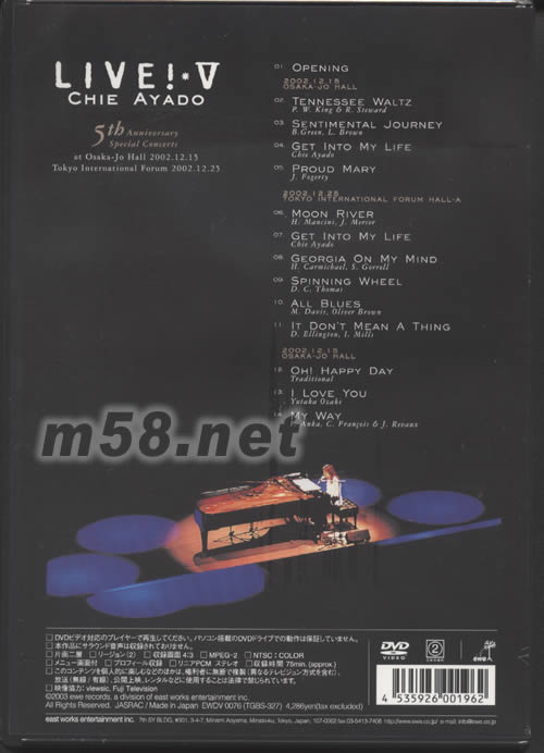 價格為估,以實到貨為準! 出道5周年紀念特別演唱會LIVE V DVD(m58.net) 5TH ANNIVERSARY AT OSAKA-JO HALL 2002.12.15 SPECIAL CONCERTS TOKYO INTERNATIONAL FORUM 2002.12.25 詳情參數請點看產品正、背面大圖 本DVD輯錄200212月綾戶智繪出道五周年紀念演唱會的精彩錄像,錄影地點包括東京的TOKYO INTERNATIONAL FORUM HALL 及大孤的OSAKA-JO HALL,共演唱14首作品,包括:TENNESSEE WALTZ,SENTIMENTAL JOURNEY ,GEORGIA ON MY MIND,MY WAY,IT DON‘T MEAN A THING等,絕對精彩!