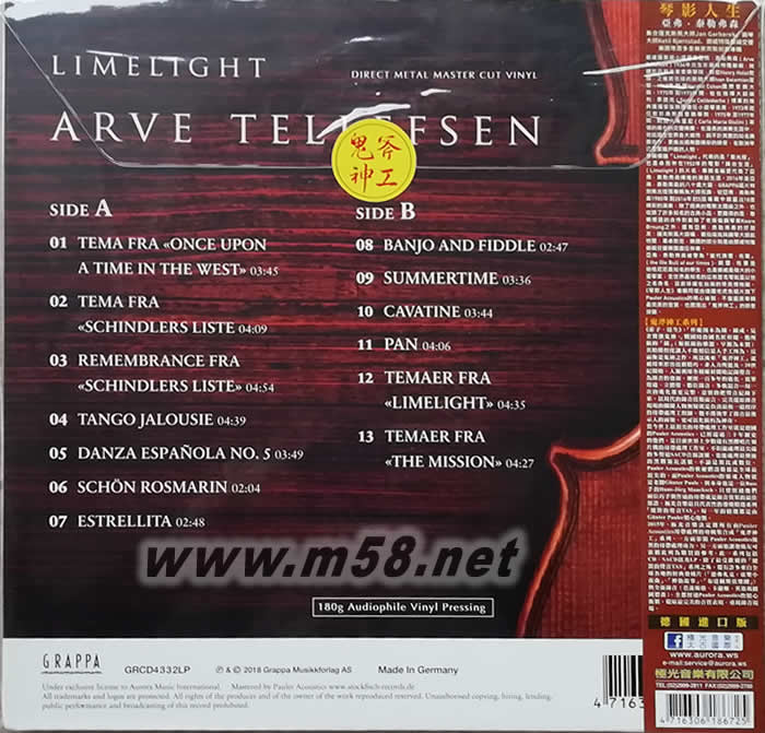 Limelight 琴影人生(LP) 鬼斧神工 180g 33RPM LP 黑膠 老虎魚(m58.net) 挪威國寶級小提琴大師亞弗.泰勒弗森80大壽紀念專輯 老虎魚唱片旗下Pauler Acoustics精心后製展現「鬼斧神工」的錄音技藝! 集合薩克斯風大師Jan Garbarek、鋼琴大師Ketil Bjørnstad、挪威特隆赫姆交響樂團等眾多音樂家齊聚祝壽 180g Audiophile Vinyl Pressing 挪威國寶級小提琴家亞弗.泰勒弗森(Arve Tellefsen)1936年出生於挪威特隆赫姆,就讀於丹麥皇家音樂學院(Royal Danish Conservatory of Music),師從Henry Holst教授,之后前往紐約跟隨大師Ivan Galamian習琴,1962年榮獲Harriet Cohen國際音樂大獎。1970年到1973年間,他在指揮大師杰利.畢達克(Sergiu Celibidache,1912-1996)領軍的瑞典廣播管弦樂團(Swedish Radio Orchestra)擔任小提琴首席,1973年起任教於奧斯陸音樂學院,1975年至1977年間,則加入朱里尼(Carlo Maria Giulini,1914-2005)率領的維也納交響樂團(Wiener Symphoniker)。在漫長的演奏生涯中,他巡迴全世界各大城市,與不計其數的知名樂團合作,更推出過無數精彩的錄音,在歐洲早已是家喻戶曉的人物。 專輯標題「Limelight」代表的是「聚光燈」,也是卓別林在1952年的電影「舞臺生涯」(Limelight)的片名,專輯名稱更代表了亞弗.泰勒弗森輝煌的演藝生涯。2016年是亞弗.泰勒弗森的八十歲大壽,GRAPPA唱片特別推出這張專輯為大師祝壽,從亞弗.泰勒弗森1980年到2016年的5張專輯中精選出18首精彩的演奏,除了經典的電影主題曲之外,也收錄了許多知名的古典小品。更難得的是,專輯里面的合作對象除了老搭檔鋼琴家Kaare Ørnung之外,還有亞弗.泰勒弗森的好朋友:薩克斯風大師楊.葛伯瑞克(Jan Garbarek)與鋼琴大師凱特爾.畢卓斯坦(Ketil Bjørnstad),樂團的部分則是由挪威特隆赫姆交響樂團(Trondheim Symphony Orchestra)擔任伴奏。 亞弗.泰勒弗森被譽為「當代奧雷.布爾」(the Ole Bull of our times),奧雷.布爾是帕格尼尼最知名的學生,也是挪威最偉大的小提琴家,全世界最知名的瓜奈里名琴就是以他之名命名,目前珍藏在臺灣的奇美博物館。《琴影人生》專輯同樣由德國老虎魚唱片旗下Pauler Acoustics的精心后製,不僅還原專輯最完美的音質,也展現出「鬼斧神工」的錄音技藝。