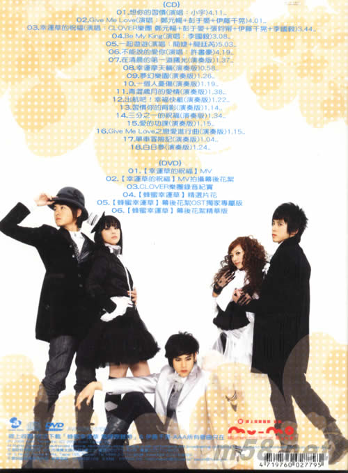 蜂蜜幸運草電視原聲帶(夢幻影音版)(m58.net) 改編自日本人氣漫畫,繼日本動畫及電影版後,由《人魚朵朵》臺灣導演李蕓嬋執導,眾青春偶像—《惡作劇2吻》鄭元暢、《基因決定我愛你》彭于晏、《白色巨塔》張鈞甯、《深海》蘇慧倫,以及李國毅、張翰、陳宇凡、歌手蘇見信與日本樂團AAA成員伊藤千晃主演這部甜蜜與夢幻的愛情劇《蜂蜜幸運草》。劇集把五位在美術大學的好友們在深摯友情下發展的兩段三角關系,如何面對愛情、友情及未來的故事,2008年搬上華視小銀幕。 適逢這套純真和清新偶像劇即將上畫,劇中主角之一鄭元暢、彭于晏、張鈞甯、伊藤千晃和李國毅還特別藉此機會組成史上最強的夢幻樂團「CLOVER幸運草樂團」,且演唱了片頭曲「幸運草的祝福」。這是一首青春洋溢和輕快的同樂歌,CLOVER幸運草樂團成功演繹了最動聽的主題曲。碟內還有眾演員合唱、由彭于晏Rap的「Give Me Love」,以及2008年度新人小宇的抒情歌「堅持著愛你」。 夢幻影音版隨碟還收錄了三首主打歌MV、錄音花絮和劇集制作特輯的DVD。
