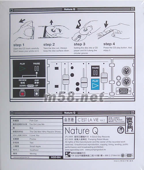 01. 魚罐頭 Fish Can 02. 像我這樣的女孩 The Girl Like Me 03. 買 Buy 04. 修鞋的阿伯 The Old Man Who Repairs Shoes 05. ICH LIEBE DICH I Love You 06. 答應(yīng)要 Promis 07. 計程車 Taxi 08. 小蘋果 Small Apple 09. 牧羊人 Goatherd 10. 搬家 Moving