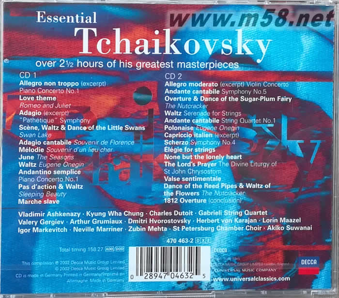 CD 1: 1. Piano Concerto No.1 In B Flat Minor, Op.23 - 1. Allegro non troppo e molto maestoso (excerpt) 9:04 Vladimir Ashkenazy, London Symphony Orchestra, Lorin Maazel 2. Romeo and Juliet, Fantasy Overture - Love Theme 3:11 Wiener Philharmoniker, Herbert von Karajan 3.Symphony No.6 In B Minor, Op.74 -"Pathétique" - 1. Adagio - Allegro non troppo (excerpt) 5:02 Philharmonia Orchestra, Vladimir Ashkenazy 4.Swan Lake, Op.20 Suite - 1. Scene - Swan Theme 2:35 5. Swan Lake, Op.20 Suite - 2. Valse in A 7:09 6. Swan Lake, Op.20 Suite - 3. Danse des petits cygnes 1:30 Wiener Philharmoniker, Herbert von Karajan 7. Sextet in D minor, Op.70 - "Souvenir de Florence" (Version for Orchestra) - 2. Adagio cantabile e con moto 7:51 Academy of St. Martin in the Fields, Neville Marriner 8. Souvenir d'un lieu cher, Op.42 - 3. Mélodie in E flat 3:37 Akiko Suwanai, Phillip Moll 9. The Seasons, Op.37b - 6. June: Barcarolle 5:23 Vladimir Ashkenazy 10. Eugene Onegin, Op.24 - Act 2 - Valse - excerpt 6:16 Kirov Orchestra, St Petersburg, Valery Gergiev 11. Piano Concerto No.1 In B Flat Minor, Op.23 - 2. Andantino semplice - Prestissimo - Tempo I 6:45 Vladimir Ashkenazy, London Symphony Orchestra, Lorin Maazel 12. The Sleeping Beauty, Op.66 - Suite - Pas d'action (Adagio) (Act 1) 6:34 13. The Sleeping Beauty, Op.66 - Suite - Waltz (Act 1) 4:06 Wiener Philharmoniker, Herbert von Karajan 14. Slavonic March, Op.31 9:06 Los Angeles Philharmonic, Zubin Mehta Total Playing Time: 1:18:09 CD 2 1. Violin Concerto in D, Op.35 - 1. Allegro moderato (excerpt) 7:37 Kyung Wha Chung, Orchestre Symphonique de Montréal, Charles Dutoit 2. Symphony No.5 In E Minor, Op.64 - 2. Andante cantabile, con alcuna licenza - Moderato con anima 12:18 London Symphony Orchestra, Igor Markevitch 3. The Nutcracker, Op.71 - Overture 3:15 4. The Nutcracker, Op.71 - Act 2: No. 14c Pas de deux: Variation II (Dance of the Sugar-Plum Fairy) 2:19 Orchestre Symphonique de Montréal, Charles Dutoit 5. Serenade for Strings in C, Op.48 - 2. Walzer: Moderato (Tempo di valse) 3:45 St. Petersburg Philharmonic Orchestra, Vladimir Ashkenazy 6. String Quartet No.1 in D, Op.11 - 2. Andante cantabile 6:31 Gabrieli String Quartet 7. Eugene Onegin, Op.24 - Polonaise 4:59 8. Capriccio Italien Op.45 5:24 Kirov Orchestra, St Petersburg, Valery Gergiev 9. Symphony No.4 in F minor, Op.36 - 3. Scherzo. Pizzicato ostinato - Allegro 5:30 London Symphony Orchestra, Igor Markevitch 10. Elegie in G for strings 8:00 Royal Philharmonic Orchestra, Vladimir Ashkenazy 11. None but the lonely heart, Op.6, No.6 (Nyet, tolko tot, kto znal) 3:06 Dmitri Hvorostovsky, Oleg Boshniakovich 12. Divine Liturgy of St John Chrysostom, Op.41 - 13. "Otche nash" 2:22 St.Petersburg Chamber Choir, Nikolai Korniev 13. Valse sentimentale, Op.51, No.6 2:06 Arthur Grumiaux, Istvan Hajdu 14. Nutcracker Suite, Op.71a - Dance of the Reed-Pipes (Merlitons) 2:34 15. Nutcracker Suite, Op.71a - Waltz of the Flowers 5:56 Wiener Philharmoniker, Herbert von Karajan 16. Overture 1812, Op.49 - Finale 3:49 Los Angeles Philharmonic, Zubin Mehta Total Playing Time: 1:19:31