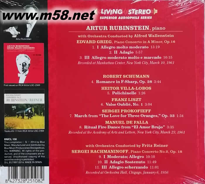 聽足一世GRIEG / RACHMANINOFF AND FAVORITE ENCORES 格里格 & 拉赫曼尼諾夫 TAS發(fā)燒名盤推介 紅色封面(m58.net) HI FI REVIEW (1/6/2015) Author: 韓拔 葛里格及拉赫曼尼諾夫的銅琴協(xié)奏曲.五首獨奏曲 這張西班牙Blue Moon公司的再版碟,將兩張經典RCA黑膠共冶一爐;它們分別是LSC-2068 (拉赫曼尼諾夫,1956年),和LSC-2566 (葛里格a小調鋼琴協(xié)奏曲,1961年)。封底的資料寫上Orchestra Conducted by Fritz Reiner,天啊,那不是just any orchestra,而是萊納棒下無與倫比的芝加哥交響樂團??! 聽鋼琴巨星魯賓斯坦(1887-1982)長大的樂迷,在洟?別多年后的今日再次聽他,感覺就好像重投那位將你一手揍大的奶媽的懷抱。她雖不是你的娘,但就給你一種無可替代的溫馨歸屬感。魯氏當年在葛里格協(xié)奏曲的封套上面紅底黑字寫明這是他個人「最完美的錄音」。(那是華倫斯坦指揮 RCA Victor樂團)比起其他鋼琴家的版本,他的表現(xiàn)是絲毫不激,全無銳角可言。大家或許仍記得,他在七零年代伙拍 Previn重錄過葛里格,且是錄影片。那時的他,雙目幾乎失明,技巧難免不復從前勇。至於拉赫曼尼諾夫第二鋼協(xié),魯氏的演譯光明磊落,風格總是予人何等健康的感覺;但亦必定有人會嫌他少了陰暗的一面。 舒曼的浪漫曲op.28,魏拉 ─ 羅保士的Polichinelle,李斯特的被遺忘的圓舞曲No.1,普羅哥菲夫的《三個橘子之戀》進行曲。與及法雅的「火祭之舞」,都是魯賓斯坦最膾炙人口的首本安哥曲;火祭之舞他還在電影《樂府春秋》中彈過的。在本錄音中,魯氏已達74歲高齡,手底下所燃燒的火。自然沒有黑白影片中的白熱化。某著名唱片監(jiān)製曾將魯賓斯坦比喻為黑麵包,可隨時隨地享用,都不會吃壞,且有益身心! 音響是面面俱圓,不但鋼琴音色靚,任何時候鋼琴都沒有被樂隊淹蓋。動態(tài)表現(xiàn)一流。