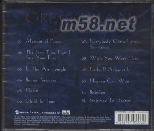 1、MOMENT OF PEACE 2、THE FIRST TIME EVER 1 SAW YOUR FACE 3、IN THE AIR TONIGHT 4、BONNY PORTMORE 5、HYMN 6、CHILD IN TIME 7、EVERYBODY GOTTA LEARN SOMETIMES 8、WISH YOU WERE HERE 9、LADY D ARBANVILLE 10、HEAVEN CAN WAIT 11、BABYLON 12、STAIRWAY TO HEAVEN