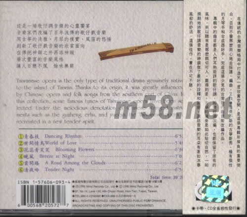 青春枝(古箏與心靈的對話5)(m58.net) 臺灣情 古箏心 月琴聲聲傳鄉音 在傳統的臺灣音樂格局中打造另一度欣賞空間,是這張專輯所背負的重要使命,否則不會那么用心地去採譜\編曲,又找來獲獎不繼的古箏新秀\極有個性的月琴手和合成器好手,完成這張少見的臺灣歌仔戲音樂改編作品. 專輯中的曲目都是人們耳熟能詳的歌仔調,即使經過改編,也都保留了原有的風味,所以聽來是那么親切可人.難得的是,古箏的演奏是如此貼切自然,一如預期地將歌仔調音樂的神韻做了最好的詮釋和創新,讓聽音樂的耳朵有著如沐春風般的舒活.這張佳作,實在不可不聽.