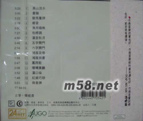 書韻(山東箏曲) 港版(m58.net) 韓先生琴技術高超,把山樂派的粗豪作風表現得淋漓盡致.<書韻>書卷氣滿布琴韻,在抑揚頓挫間,表現著箏藝的頂峰.駿馬奮蹄,一把小小的箏竟然有萬奔騰之勢. --HI FI 音響/LEO 在韓庭貴手里,古箏竟然具備大鍵琴,堅琴.吉它,琵琶,揚琴和古琴的特點. --經濟昌報/送延益 作為音樂欣賞也好,作為音樂教科書來讀也好,作為音響試機也好,都非常有價值. --TOP MUSIC/馮禮慈