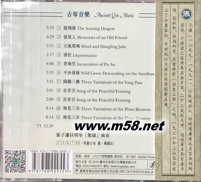 廣陵琴韻(一)古琴演奏:張子謙、戴樹紅(m58.net) 張子謙,(一八八九一九九一),江蘇儀征人,細長時隨廣陵派各家孫紹陶習琴,十余歲已能演奏名曲多首,二十三歲赴天津認識著名琴家查阜西,彭祉卿,結為知音,在當時有[浦東三杰]之稱,一九三六年三位琴師成立了今虞琴社,半世紀以來在古琴界影響至廣.