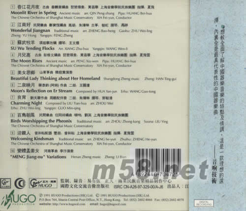 1. 春江花月夜(古曲 秦鵬章編曲 琵琶領奏:黃蓓華 上海音樂學院民族樂團 指揮:夏飛) 2. 江南好(民間樂曲 鄭寶恒編曲 高胡:朱瑋琳 古箏:郁虹 揚琴:馮錚) 3. 蘇武牧羊(項祖華改編 揚琴:王文禮) 4. 月兒高(古曲 彭修文編曲 琵琶領奏:王蓓華 上海音樂學院民族樂團 指揮:夏飛云) 5. 美女思鄉(山東古箏:韓庭貴演奏) 6. 二泉映月(華彥鈞(阿炳)作曲 二胡:王國漳) 7. 良宵(劉天華作曲 周雄配伴奏 二胡:朱瑋琳 揚琴:郭敏清) 8. 百鳥朝鳳(民間樂曲 任同袢編曲 嗩吶:劉英 上海音樂學院民族樂團 ) 9. 迎親人(曾和耘配器 墜胡:曾和耘 上海音樂學院民族樂團 指揮:夏飛云) 10. 變體孟姜女(河南古箏:李汴演奏)