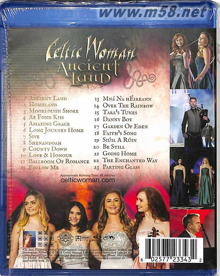 價格為估,以實到貨為準! Ancient Land 遠古仙境 BD(m58.net) 藍光影碟超高畫質完美呈現 ★愛爾蘭首席女子美聲天團,2018愛爾蘭古堡演唱會藍光實況完美收錄 ★收錄"Mná na hÉireann (Women Of Ireland)"、"Moorlough Shore"等歌曲 完美駕馭Celtic傳統民族音樂,兼容Folk、New-Age Music、Christian AC、Pop Classical以及跨界美聲,Celtic Woman可以說是愛爾蘭地區的首席女子美聲天團;雖然多年來團員經常更換,但Celtic Woman依舊保有她們的典范,持續在樂界創造出人類最美的聲響。 Celtic Woman成立於2004年的愛爾蘭,目前由Máiréad Carlin、Éabha McMahon、Tara McNeill以及新加入的Megan Walsh等四人組成,歷年來釋出多張經典作品,12次闖入美國告示牌排行榜,總計她們的CD與DVD加總在全球超過千萬張銷售,可以說是美聲女團的代表性組合之一。2018年Celtic Woman除了帶來全新第13張專輯【Ancient Land】之外,她們更在同年的9月13與14日,於歷史悠久的愛爾蘭古堡Johnstown Castle中連續演出兩晚,完美無比的音樂氛圍,被收錄為此張【Ancient Land】愛爾蘭現場演唱實況。 【Ancient Land】愛爾蘭現場演唱實況中收錄了演唱的23首曲目,除了新歌"Ancient Land"、"Homeland"、"Moorlough Shore"、"Ae Fond Kiss"、"Mná na hÉireann (Women Of Ireland)"之外,更有經典的"Siúil A Rúin"、"Parting Glass"、"Over The Rainbow"、"Amazing Grace"等歌曲,讓沒有參與到的人,透過音樂與影像的渲染,擁有身歷其境的體驗。