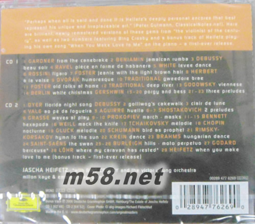音樂(lè)會(huì)安可曲經(jīng)典錄音(1944-946)It Ain`t Neccessarloy So(古典愛(ài)好者必備)(m58.net) 很顯然,歷史錄音的整理再版,無(wú)論對(duì)大公司還是小公司而言,都是有待進(jìn)一步開(kāi)發(fā)的重要市場(chǎng)。尤其是已故大師級(jí)演奏家們的歷史錄音,更是價(jià)值無(wú)法估量的珍貴遺產(chǎn)。 DG公司近期就推出一套名為《海菲茲:毋須如此》(It Ain't Necessarily So)的歷史錄音再版雙CD,價(jià)格僅售單碟價(jià),而且其中部分內(nèi)容更是從未以CD形式出版的珍貴錄音,這對(duì)于小提琴音樂(lè)愛(ài)好者形成的誘惑力之大是可想而知的。 這套雙CD收錄的是海菲茲于1944年到1946年間,在Decca和DG公司灌錄的共計(jì)52首小提琴小品,也等于是他盛年時(shí)期的真實(shí)記錄。盡管受到時(shí)代的技術(shù)水平限制,這些單聲道錄音的品質(zhì)無(wú)法與海菲茲后期的立體聲錄音相提并論,但是它們經(jīng)過(guò)完善的技術(shù)處理、修補(bǔ)后,依然呈現(xiàn)出相對(duì)令人滿意的聲音效果。 這套錄音中的樂(lè)曲,既有樂(lè)迷熟悉的通俗名曲,也包括不少比較冷門(mén)、偏門(mén)作曲家的作品,盡展大師的高超演奏技藝,以及他超越不少同行的寬廣胸襟。甚至其中還收錄有從未曝光過(guò)的海菲茲演奏鋼琴的錄音,可以說(shuō)聽(tīng)完這套錄音,可以讓我們對(duì)這位絕代小提琴大師有更全面的認(rèn)識(shí)。