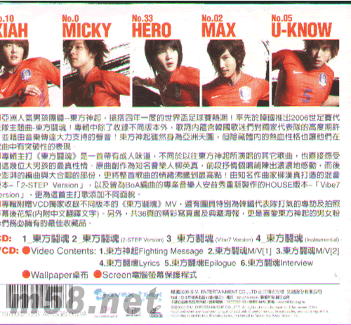 亞洲人氣男孩團體-東方神起,搶搭四年一度的世界杯足球賽熱潮!率先于韓國推出2006世足賽代表隊主題曲─東方鬪魂!專輯中除了收錄不同版本外,歌詞內蘊含韓國歌迷們對國家代表隊的高度期許,并藉由音樂傳達大力支持的聲音!東方神起雖然身為亞洲天團,但隱藏體內的熱血性格也讓他們在歌曲中有突破性的表現。 專輯主打《東方鬪魂》是一首帶有點成人味道,不同于以往東方神起所演唱的其它歌曲,也直接感受到這幾位大男孩的最真性情。原曲創作為知名音樂人柳英真,前段抒情個唱鋪陳出濃濃地感動,而后段澎湃的編曲與大合唱的部份,更將整首歌曲的情緒沸騰到最高點!由知名作曲家柳漢真打造的混音版本—「2–STEP Version」,以及曾為BoA編曲的專業音樂人安益秀重新制作的—「House」版本,更為這首主打歌添加不同面貌。 專輯附贈VCD獨家收錄不同版本的《東方鬪魂》MV,還有團員特別為韓國代表隊打氣的專訪及拍照等幕后花絮(內附中文翻譯文字)。另外,共36頁的精彩寫真書及典藏海報,更是喜愛東方神起的男女粉絲們務必擁有的最佳收藏品。