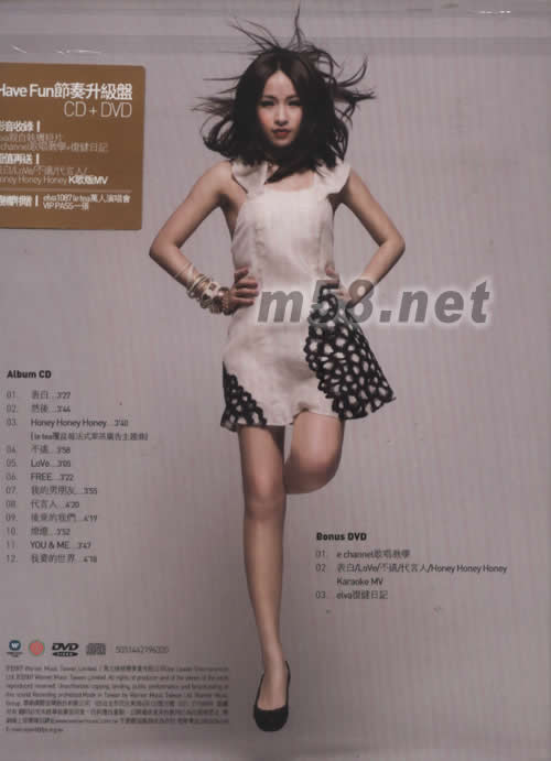1087+139節奏升級盤(m58.net) 醞釀139個日子迎接更令人期待的ELVA蕭亞軒 HAVE FUN節奏升級盤CD+DVD DVD影音收錄 ELVA親自執導E CHANNEL歌唱教學 表白LOVE 不遠代言人HONEY HONEY HONEY歌版MV 復健日記 1087的誕生太不容易,因為太過認真苦練舞蹈,亞軒不慎拉傷韌帶,不得已去美國治療。但是塞翁失馬,康復的EVLA比任何人都懂得了健康的可貴,也發現一個歌手其實最應該關注的是音樂,舞蹈始終是次要位置,不應本末倒置,使自己受傷!