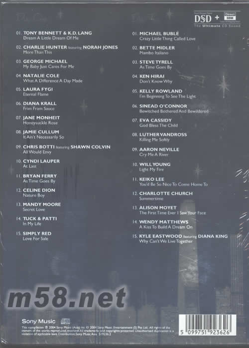 DISC 1 1、TONY DENNETT&K D LANG/DREAM A LITTLE DREAM OF ME 2、CHARLE HUNTER/FEATURING NORAH JONES/MORE THAN THIS 3、GEORGE MICHAEL/MY BABY JUST CARES FOR ME 4、NATALIE COLE/WHAT A DIFFERENCE A DAY MADE 5、LAURA FYGI/ETERNAL FLAME 6、DINANA CRALL/FRIM FRAM SAUCE 7、JANE MONHEIT/HONEYSUCKLE ROSE 8、JAMIE CULLUM /IT AIN‘T NECESSARILY SO 9、CHRIS BOTTI FEATURING SHAWN COLVIN/ALL WOULD ENVY 10、CYNDI LAUPWER/AT LAST 11、BRYAN FERRY/AS TIME GOES BY 12、CELINE DION/NATURE BOY 13、MANDY MOORE/SECRET LOVE 14、TUCK PATTI/IN MY LIFE 15、SIMPLY RED /LOVE FOR SALE DISC 2 1、MICHAEL BUBLE/CRAZY LITTLE THING CALLED LOVE 2、BETTE MIDLER/MAMBO ITALIANO 3、STEVE TYREL/AS TIME GOES BY 4、KEN HIRAI/DON’T KNOW WHY 5、KELLY ROWLAND/I‘M BEGINNING TO SEE THE LIGHT 6、SINEAD O’CONNOR/BEWITCHED BOTHERED AND BEWILDERED 7、EVA CASSIDY /GOD BLESS THE CHILD 8、LUTHER VANDROSS/KILLING ME SOFTLY 9、AARON NEVILLE/CRY ME A RIVER 10、WILL YOUNG/LIGHT MY FIRE 11、KEIKO LEE/YOU‘D BE SO NICE TO COME HOME TO 12、CHARLOTTE CHOUCH/SUMMERTIME 13、ALISON MOYET/THE FIRST TIME EVER I SAW YOUR FACE 14、WENDY MATTHEWS/A KISS TO BUILD A DREAM ON 15、KYLE EASTWOOD FEATURING DINANA KING /WHY CAN’T WE LIVE TOGETHER