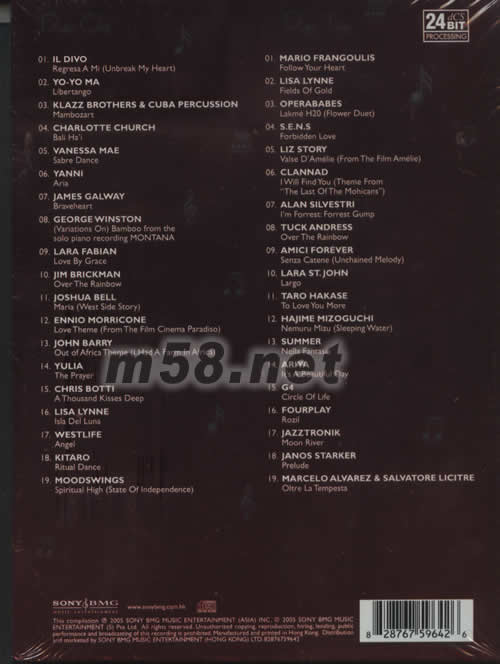 DICS ONE 01. IL DIVO – Regresa A Mi (Unbreak My Heart) 02. Yo-Yo Ma – Libertango 03. Klazz Brothers & Cuba Percussion – Mambozart 04. Charlotte Church – Bali Ha'i 05. Vanessa Mae – Sabre Dance 06. Yanni – Aria 07. James Galway – Braveheart 08. George Winston – (Variations on) Bamboo fromthe solo piano recording MONTANA 09. Lara Fabian – Love By Grace 10. Jim Brickman – Over The Rainbow 11. Joshua Bell – Maria (West Side Story) 12. Ennio Morricone – Love Theme (from The Film Cinema Paradiso) 13. John Barry – Out Of Africa Theme (I Had A Farm In Africa) 14. Yulia – The Prayer 15. Chris Botti – A Thousand Kisses Deep 16. Lisa Lynne – Isla De Luna 17. Westlife – Angel 18. Kitaro – Ritual Dance 19. Moodswings – Spiritual High (State Of Independence) DISC TWO 01. Mario Fangoulis – Follow Your Heart 02. Lisa Lynne – Fields Of Gold 03. OperaBabes – Lakme’H20 (Flower Duet) 04. S.E.N.S – Forbidden Love 05. Liz Story – Valse D’Amelie (From The Film Amelie) 06. Clannad – I Will Find You (Theme From"The Last Of The Mohicans" 07. Alan Silvestri – I’m Forrest, Forrest Gump 08. Tuck Andress – Over the Rainbow 09. Amici Forever – Senza Catene (Unchained Melody) 10. Lara St. John - Largo 11. Taro Hakase – To Love You More 12. Hajime Mizoguchi – Nemuru Mizu (Sleeping Water) 13. Summer – Nella Fantasia 14. Ariya – It’s A Beautiful Day 15. G4 – Circle Of Life 16. Fourplay – Rozil 17. Jazztronik – Moon River 18. Janos Starker – Prelude 19. Marcelo Alvarez & Salvatore Licitre – Oltre La Tempesta