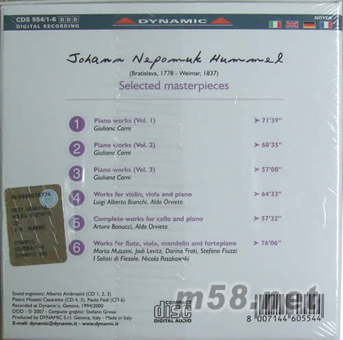 HUMMEL胡梅爾精選作品專輯(m58.net) 胡梅爾精選作品專輯 奧地利著名作家胡梅爾亦是出色的鋼琴家,作品多以協(xié)奏曲和鋼琴作品為主,室內(nèi)樂(lè)及合唱作品亦受歡迎.著名鋼琴演奏家科尼 小提琴家比安基,中提琴日家?jiàn)W維圖.長(zhǎng)笛演奏家費(fèi)馬仙尼中提琴家利維茲,曼多林演奏弗蒂,古鋼琴家費(fèi)洛斯及費(fèi)爾蘇里樂(lè)園演奏多首胡梅爾的經(jīng)典鋼琴,小提琴,大提琴,及室樂(lè)經(jīng)典作品,使你全面認(rèn)識(shí)他的永垂不朽之作.