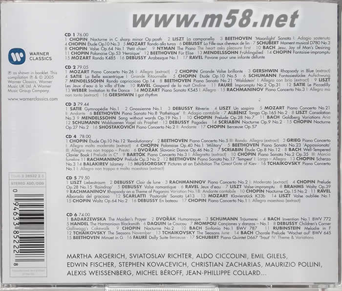 CD1 01. 蕭邦:升C小調(diào)夜曲,遺作(普雷特涅夫) 02. 李斯特:練習(xí)曲「鐘」(安德列.瓦茲) 03. 貝多芬:升C小調(diào)第十四號(hào)鋼琴奏鳴曲,作品十四第二號(hào)「月光」-持續(xù)的慢板(普雷特涅夫) 04. 蕭邦:練習(xí)曲,作品十第三號(hào)「離別曲」(布寧) 05. 莫札特:A大調(diào)鋼琴奏鳴曲,K331「土耳其進(jìn)行曲」-第三樂章:快板(琳潘妮) 06. 德布西:前奏曲第一冊(cè)-棕髮女郎(琳潘妮) 07. 舒伯特:樂興之時(shí),D780第三號(hào):中庸的快板(柯瓦契維奇) 08. 蕭邦:降D大調(diào)圓舞曲,作品六十四第一號(hào)(奧格當(dāng)) 09. 尼曼:「鋼琴師與她的情人」原聲帶-心渴望歡愉(麥可尼曼) 10. 巴哈(海絲改編):耶穌世人期待的喜悅(魏森柏格) 11. 蕭邦:降A(chǔ)大調(diào)英雄波蘭舞曲(阿格麗希) 12. 貝多芬:給愛麗絲(波米葉) 13. 孟德爾頌:春之歌,作品六二第六號(hào)(波米葉) 14. 蕭邦:升C小調(diào)幻想即興曲,作品六六(布寧) 15. 莫札特:D大調(diào)輪旋曲,K485(布寧) 16. 德布西:第一號(hào)華麗曲(契可里尼) 17. 拉威爾:死公主的孔雀舞(歐絲特) CD2 01. 莫札特:D大調(diào)第二十六號(hào)鋼琴協(xié)奏曲,K537「加冕」-第一樂章:快板(節(jié)錄、札卡利亞斯) 02. 蕭邦:降E大調(diào)華麗大圓舞曲,作品十八(魏森柏格) 03. 蓋西文:藍(lán)色狂想曲(節(jié)錄、韋恩.馬歇爾) 04. 薩提:古怪的美人兒:第一曲(契可里尼) 05. 蕭邦:降G大調(diào)練習(xí)曲,作品十第五號(hào)(布寧) 06. 舒曼:幻想小品「飛翔」,作品十二第二曲(阿格麗希) 07. 孟德爾頌:E大調(diào)奇想風(fēng)輪旋曲,作品十四(羅洛夫) 08. 貝多芬:C大調(diào)第二十一號(hào)鋼琴奏鳴曲,作品五三「華德斯坦」-第一樂章:快板(奧格當(dāng)) 09. 李斯特:巡禮之年:第三年,義大利-夏宮的噴泉(安德列瓦茲) 10. 拉威爾:夜的加斯帕-水妖安婷(阿格麗希) 11. 佛瑞:F小調(diào)第二號(hào)即興曲,作品三十一(歐絲特) 12. 薩提:皮卡迪利大道(契可里尼) 13. 韋伯:邀舞,作品六五(布倫霍夫) 14. 莫札特:C大調(diào)鋼琴奏鳴曲,K545-第一樂章:快板(札卡利亞斯) 15. 拉赫曼尼諾夫:D小調(diào)第三號(hào)鋼琴協(xié)奏曲,作品三十-第三樂章:不太過份的快板(節(jié)錄,魏森柏格) 16. 蓋西文(匈菲爾德改編):「節(jié)奏在我心變奏曲」(韋恩.馬歇爾) CD3 01. 薩提:第一號(hào)金諾佩第曲(契可里尼) 02. 薩提:第一號(hào)克諾塞斯城的女子(契可里尼) 03. 德布西:夢(mèng)幻(契可里尼) 04. 李斯特:嘆息(安德列.瓦茲) 05. 莫札特:C大調(diào)第二十一號(hào)鋼琴協(xié)奏曲,K467-第二樂章:行板(史提芬.霍夫) 06. 貝多芬:C小調(diào)第八號(hào)鋼琴奏鳴曲「悲愴」-第二樂章:如歌的行板(柯瓦契維奇) 07. 阿爾班尼士(戈德夫斯基改編):探戈,作品一六四第二號(hào)(琳潘妮) 08. 李斯特:第三號(hào)安慰曲(巴托) 09. 孟德爾頌:E大調(diào)第一號(hào)無言歌,作品十九第一號(hào)(艾德尼) 10. 蕭邦:A大調(diào)前奏曲,作品二十八第七號(hào)(奧格當(dāng)) 11. 巴哈:郭德堡變奏曲,BWV988-主題(蒂珀) 12. 舒曼:森林情景,作品八二-:預(yù)言鳥(琳潘妮) 13. 德布西:版畫-第一曲:寶塔(歐絲特) 14. 史克里亞賓:降D大調(diào)夜曲,作品九第二號(hào)(魏森柏格) 15. 蕭邦:降D大調(diào)夜曲,作品二十七第二號(hào)(契可里尼) 16. 蕭士塔高維奇:F大調(diào)第二號(hào)鋼琴協(xié)奏曲,作品一零二-第二樂章:慢板(亞列席夫) 17. 蕭邦:降D大調(diào)搖籃曲,作品五七(杜諾荷) CD4 01. 蕭邦:C小調(diào)第練習(xí)曲,作品十第十二號(hào)「革命」(布寧) 02. 貝多芬:降E大調(diào)第五號(hào)鋼琴協(xié)奏曲「皇帝」-第三樂章:輪旋曲(節(jié)錄,吉列爾斯) 03. 葛利格:A小調(diào)鋼琴協(xié)奏曲,作品十六-第一樂章:中庸的快板(節(jié)錄,李希特) 04. 蕭邦:A大調(diào)第三號(hào)波蘭舞曲,作品四十第一號(hào)「軍隊(duì)」(奧格當(dāng)) 05. 貝多芬:F小調(diào)第二十三號(hào)鋼琴奏鳴曲,作品五七「熱情」-第三樂章:不太快的快板(琳潘妮) 06. 德弗札克:E小調(diào)斯拉夫舞曲,作品四十六第二號(hào):詼諧風(fēng)的快板(貝羅夫、柯拉德) 07. 史克里亞賓:練習(xí)曲,作品八第十二號(hào)(柯瓦契維奇) 08. 巴哈:平均律鋼琴曲集,第一冊(cè)-第一曲:C大調(diào)前奏曲(艾德恩.費(fèi)雪) 09. 巴爾托克:第三號(hào)鋼琴協(xié)奏曲-第一樂章:小快板(彼得杜諾荷) 10. 蕭邦:降B大調(diào)第二號(hào)鋼琴奏鳴曲,作品三十五-第三樂章:葬禮進(jìn)行曲(普雷特涅夫) 11. 拉赫曼尼諾夫:升C小調(diào)前奏曲,作品三第二號(hào)(魏森柏格) 12. 貝多芬:D小調(diào)第十七號(hào)鋼琴奏鳴曲,作品三一第號(hào)「暴風(fēng)雨」-第一樂章:慢板(柯瓦契維奇) 13. 蕭邦:升F小調(diào)第三號(hào)詼諧曲,作品三九(阿格麗希) 14. 巴拉基雷夫:伊斯拉美(加富禮洛夫) 15. 穆索斯基:展覽會(huì)之畫-基輔的大門(魏森柏格) 16. 柴可夫斯基:降B大調(diào)第一號(hào)鋼琴協(xié)奏曲,作品二十三-第一樂章:不太過份的快板(節(jié)錄,加富禮洛夫) CD5 01. 李斯特:愛之夢(mèng)(魏森柏格) 02. 德布西:貝加摩組曲-月光(魏森柏格) 03. 拉赫曼尼諾夫:C小調(diào)第二號(hào)鋼琴協(xié)奏曲,作品十八-第一樂章:中板(節(jié)錄,加富禮洛夫) 04. 蕭邦:降D大調(diào)前奏曲,作品二十八第十五號(hào)「雨滴」(奧格當(dāng)) 05. 德布西:浪漫風(fēng)圓舞曲(契可里尼) 06. 拉威爾:水之戲(歐絲特) 07. 李斯特:即興圓舞曲(魏森柏格