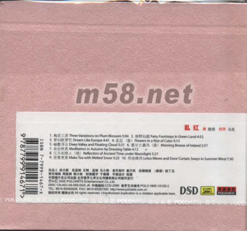 01 梅花三弄 EHREE VARIATIONS ON PLUM BLOSSOM 02 綠野仙蹤 FAIRY FOOTSTEPS IN GREEN LAND 03 夢幻歐羅巴 DREAM LIKE EUROPE 04 亂紅(笛) FLOWERS IN A RIOT OF COLOR 05 岫壑浮云 DEEP VALLEY AND FLOATING CLOUD 06 愛爾愛晨風(笛) MOMING BREEZE OF LRELAND 07 妝臺秋思 MEDITATION IN AUTUMN BY DRESSLNG TABLE 08 江月初照人(塤) REFLECTION OF ANCIENT TIME UNDER MOONLIGHT 09 苦雪烹茶 MAKE TEA WITH MELTED SNOW 10 簾動荷風 LOTUS WAVES AND DOOR CURTAIN SWAYS IN SUMMER WIND