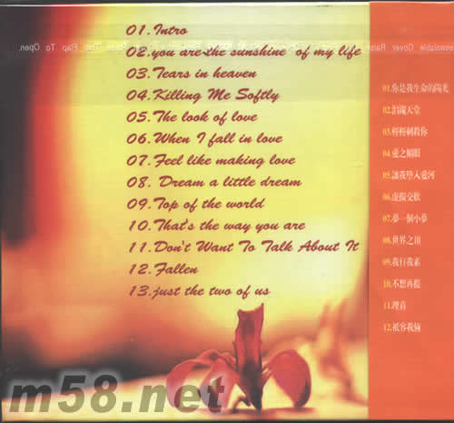 1、INTRO 2、YOU ARE THE SUNSHINE OF MY LIFE/你是我生命的陽光 3、TEARS IN HEAVEN/淚灑天堂 4、KILLING ME SAFTLY/溫柔的殺我 5、THE LOOK OF LOVE/愛之媚眼 6、WHEN I FALL IN LOVE/當我墮入愛河 7、FEEL LIKE MAKING LOVE/虛擬交歡 8、DREAM A LITTLE DREAM/夢一個小夢 9、TOP OF THE WARLD/世界之巔 10、THAT‘S THE WAY YOU ARE/我行我素 11、DON’T WANT TO TALK ABOUT IT /不想再提 12、FALLEN/埋首 13、JUST THE TWO OF US /只容我倆
