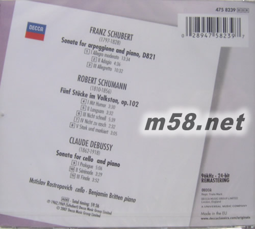 這是Decca Legends 傳奇唱片系列最具經典色彩、最超值的唱片之一,羅斯特羅波維奇絕對是詮釋舒伯特 的不二權威,這個“傳奇”專輯中的舒伯特阿佩喬尼奏鳴曲被譽為此曲的最佳版本。舒伯特這首獨特作品 原是為六根弦的阿佩喬尼琴所作,羅斯特羅波維奇改以四根弦的大提琴演奏,技巧卻絲毫不見滯澀,可見 其功力之深。布里頓雖以作曲家名世,但其鋼琴演奏同樣出色,體現了互為襯托的效果。此外,這張唱片 還收錄了舒曼五首民謠 Op. 102、德彪西D小調大提琴奏鳴曲,兩位大師的配合天衣無縫,相得益彰,成 就了這張彌足珍貴的天碟。