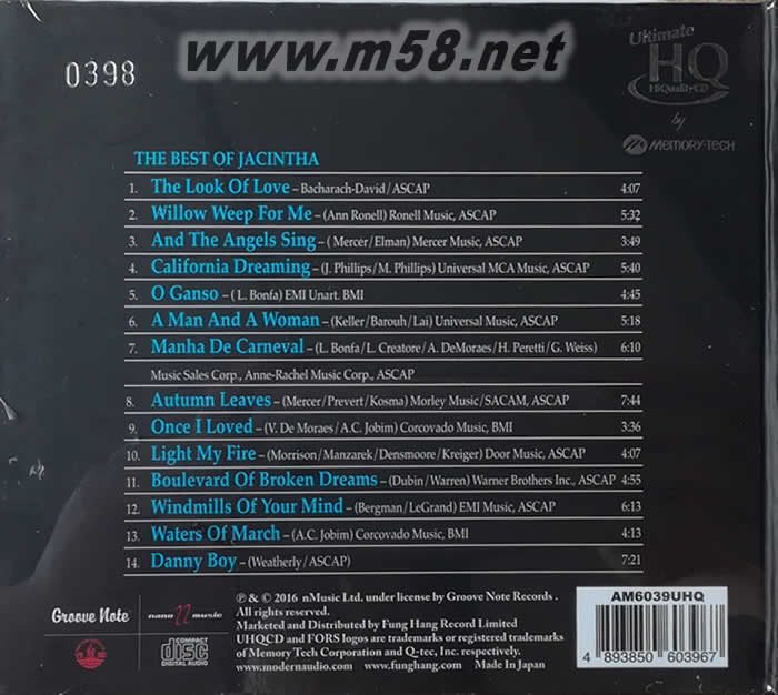 1. The Look Of Love(選自Here's To Ben, GRVSA1001) 2. Willow Weep For Me(選自Jacintha Is Her Name, GRVSAM1014) 3. And The Angels Sing(選自Autumn Leaves, GRVSA1006) 4. California Dreaming(選自Jacintha Goes To Hollywood, GRVSA1040) 5. O Ganso(選自The Girl From Bossa Nova, GRVSAM1026) 6. A Man And A Woman(選自Jacintha Goes To Hollywood, GRVSA1040) 7. Something Cool(選自Jacintha Is Her Name, GRVSAM1014) 8. Mahna Da Carnevale(選自L(fǎng)ush Life, GRVSAM1011) 9. Autumn Leaves(選自Autumn Leaves, GRVSA1006) 10. Once I Loved(選自The Girl From Bossa Nova, GRVSAM1026) 11. Light My Fire(選自Jacintha Is Her Name, GRVSAM1014) 12. Blvd Of Broken Dreams(選自L(fǎng)ush Life, GRVSAM1011) 13. Windmills Of Your Mind(選自Jacintha Goes To Hollywood, GRVSA1040) 14. Waters Of March(選自The Girl From Bossa Nova, GRVSAM1026) 15. Danny Boy(選自Here's To Ben, GRVSA1001)